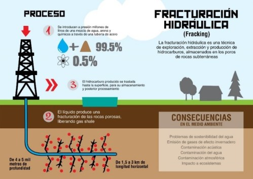 Las exploraciones y explotaciones petroleras y de gas, son otras fuentes de destrucción de los ecosistemas y contaminación de tierras, aguas y aire. Está por iniciarse la explotación de gas y petróleo por el fracking o fractura hidráulica en San Luis Potosí, Tamaulipas y Coahuila, donde se han encontrado depósitos de esquistos, ricos en gas y petróleo, lo que implica el uso de grandes cantidades de agua y la contaminación de suelo, aire y mantos acuíferos por la gran cantidad de químicos contaminantes que utilizan.