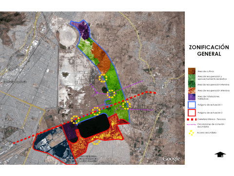 - La tercera acción es el equipamiento deportivo y social, con un parque deportivo, equipar los perímetros de cuerpos de agua como el Lago Nabor Carrillo y la Laguna Recreativa y módulos de servicios de emergencia. Se consideran dos polígonos: al sur el Lago Nabor Carrillo y al norte el polígono bardeado, con una superficie total de 5,897.7 hectáreas (ha). Dentro del polígono bardeado las superficies para las diversas obras son: cuerpos de agua para regulación hidráulica con una superficie de 483.9 ha, lagunas y humedales con acceso público (694.5 ha), zona de reserva biocultural (3,239.1 ha) y un parque con equipamiento social y deportivo (382.5 ha).