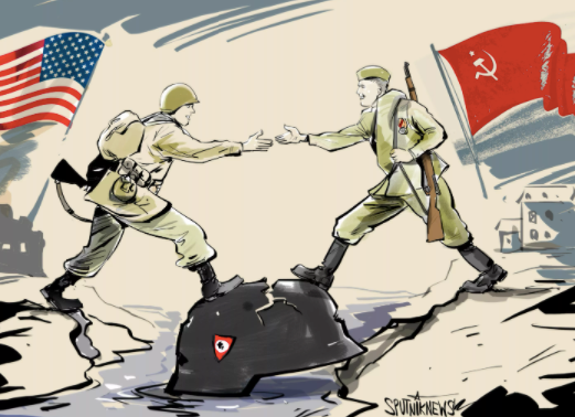 Arriba a la izquierda: Conferencia de Yalta. (Foto: Wikipedia). Abajo a la izquierda: Conferencia de Potsdam. (Foto: Deutsche Welle). A la derecha: alegoría que muestra a soldados de Estados Unidos y la Unión Soviética saludándose después de derrotar a Alemania. (Imagen: Agencia Sputnik).