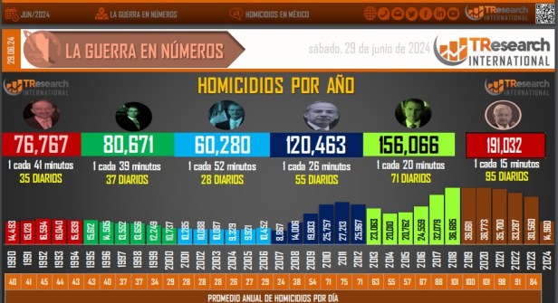 Un dato es suficiente para demostrarlo: entre el 1 de diciembre de 2018 y el 28 de junio de 2024, o sea, en lo que va del mandato de López Obrado, se han cometido 191 mil 32 homicidios dolosos. (En el de Enrique Peña Nieto fueron, en total, 156 mil 66; en el de Felipe Calderón Hinojosa, 120 mil 463; en el de Vicente Fox Quesada, 60 mil 280; en el de Ernesto Zedillo Ponce de León, 80 mil 671, y en el de Carlos Salinas de Gortari, 76 mil 767).