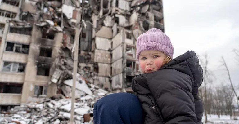Imagen ilustrativa: «Oleksandr camina por el patio con su hija Michelle, de dos años, en Saltivka, Ucrania».