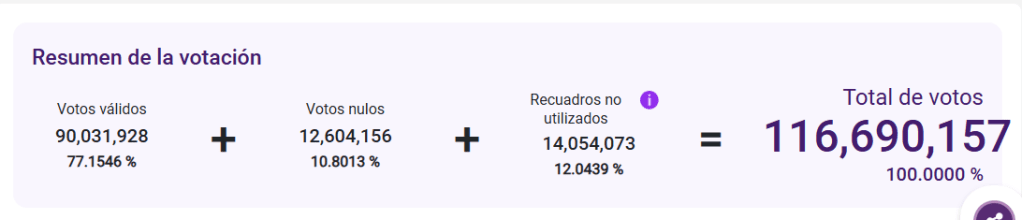 Según el INE, los votos válidos representaron el 77.1546 %; los votos nulos sumaron el 10.8013 %, y las boletas dejadas en blanco, el 12.0439 %.