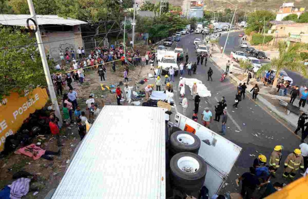 Volcadura de un tráiler que trasladaba a migrantes. El accidente ocurrió el 9 de diciembre de 2021 en Tuxtla Gutiérrez, Chiapas. El saldo fue de 49 personas muertas y 58 lesionadas. Foto: Capital 21.