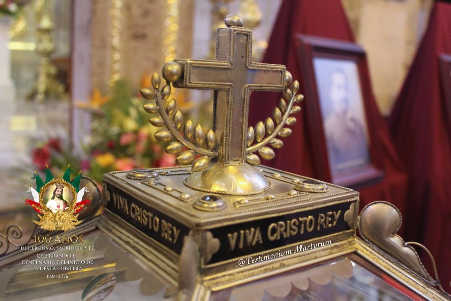 Cruz que coronó el bello relicario en que fueron expuestas, para pública veneración de los feligreses tapatíos, algunos restos ex ossibus –de los huesos– de cinco Beatos Mártires Mexicanos: Anacleto González Flores y los hermanos Jorge y Ramón Vargas González y Salvador y Ezequiel Huerta Gutiérrez, el 1 de abril de 2022*, en la Capilla de Jesús –Templo del Dulce Nombre de Jesús– en Guadalajara.