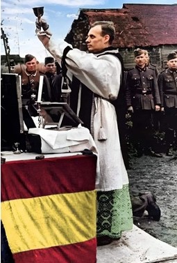 El papel del capellán castrense es igual en todos los ejércitos del mundo: servir a su grey, a sus fieles militares. En este plano no hubo diferencia entre la División Azul y sus homólogas alemanas.