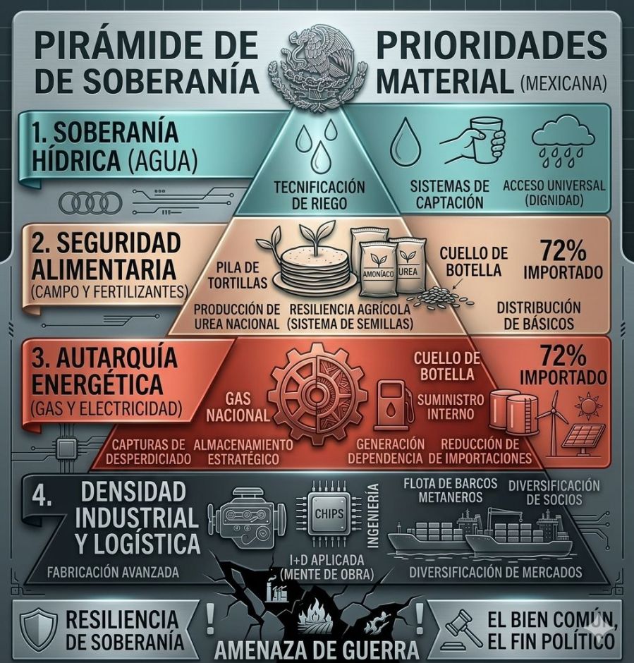 Ésta debe ser una acusación formulada con serenidad: el problema de México no es sólo que el gobierno se equivoque en un punto u otro; el problema es que carece de una jerarquía suficientemente madura sobre lo que de verdad sostiene a un país. Se discute con intensidad el reparto del poder y con menor atención las condiciones materiales de la supervivencia nacional. En tiempos de normalidad, eso ya era un error. En tiempos de guerra y reordenamiento global, se vuelve una vulnerabilidad.
