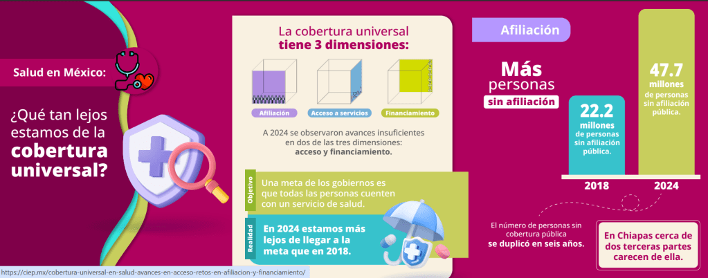 - La afiliación presenta el mayor retroceso. En 2024, el número de personas sin afiliación a ningún sistema público de salud se duplicó: pasó de 22.2 millones en 2018 a 47.7 millones; en Chiapas, cerca de dos terceras partes de la población no reportan cobertura.