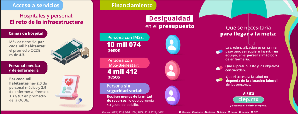 A nivel territorial, la desigualdad es marcada: mientras en estados como Nuevo León y Coahuila más del 75 % de la población reporta alguna afiliación, en Chiapas cerca de dos terceras partes carecen de ella. En cuanto al financiamiento, aún persiste la desigualdad en el presupuesto. Para 2026, el gasto anual por persona afiliada al IMSS es de 10 mil 074 pesos; y para el IMSS-Bienestar es de 4 mil 412 pesos.